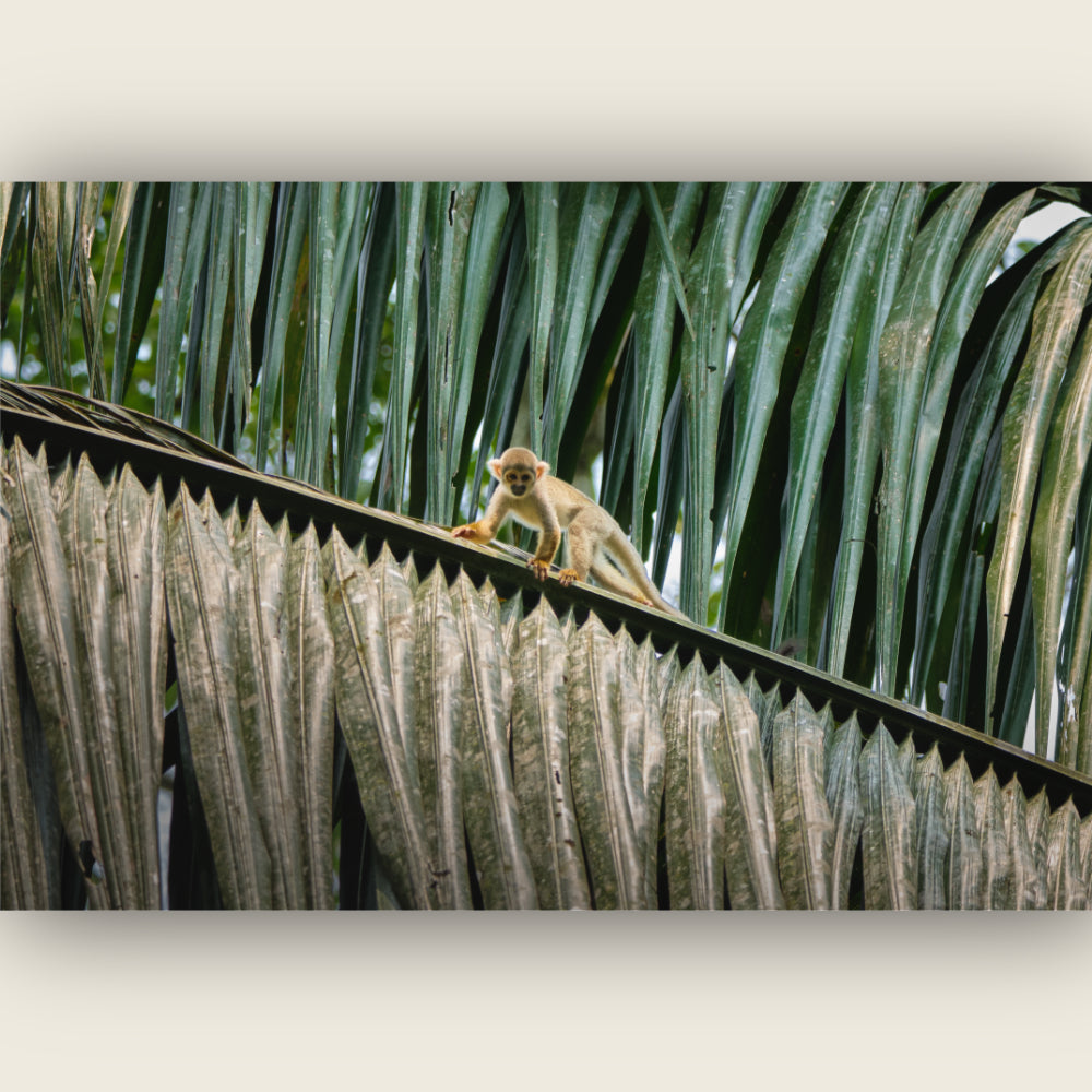 Un creux dans les feuillages. Le regard accroche une forme, un équilibre. Un singe écureuil, immobile, presque fondu dans la ligne des branches. Il ne reste qu’un souffle, et puis plus rien.